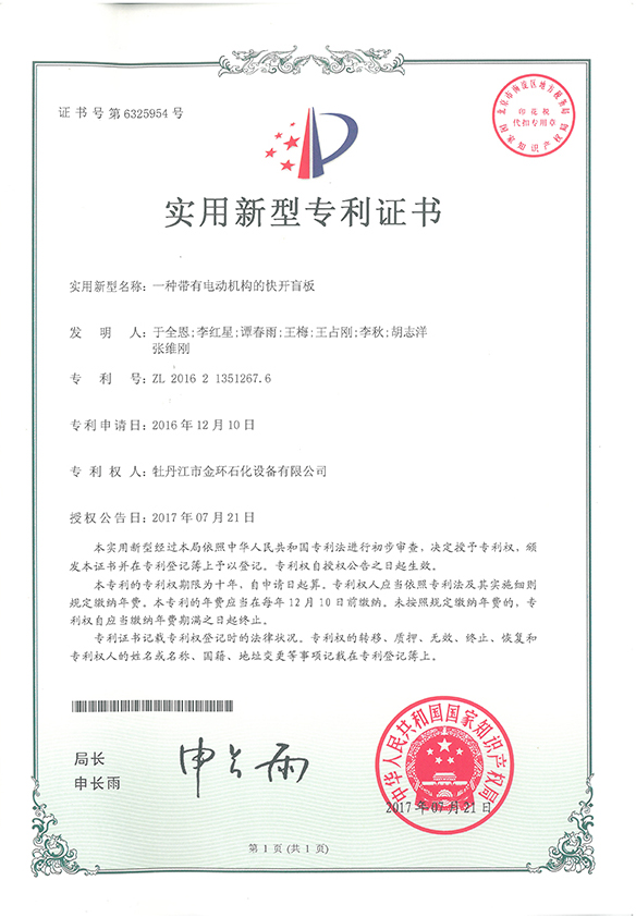 一種帶有電動機構的快開盲板實用新型專利證書ZL 2016 2 1351267.6